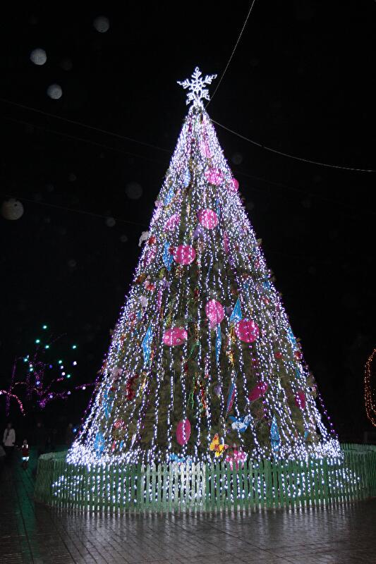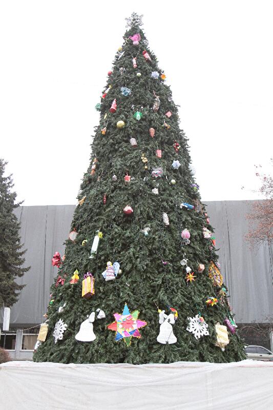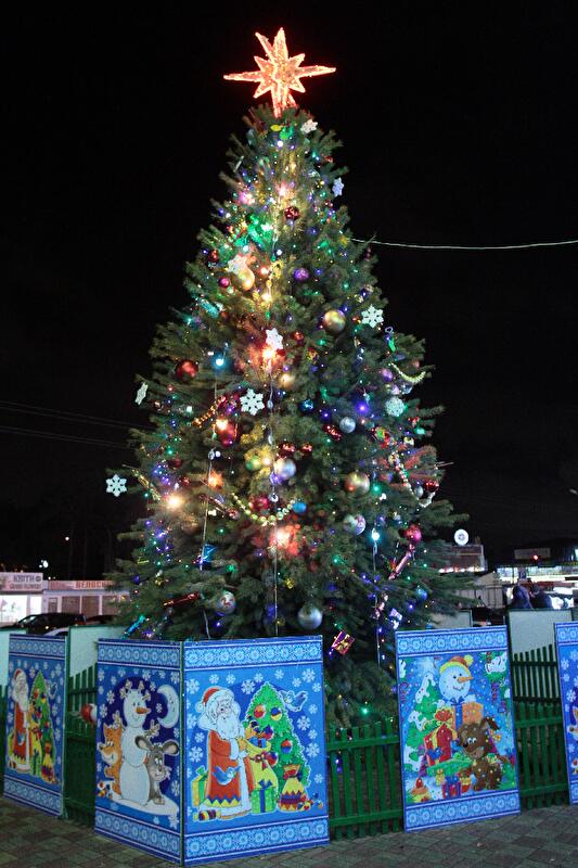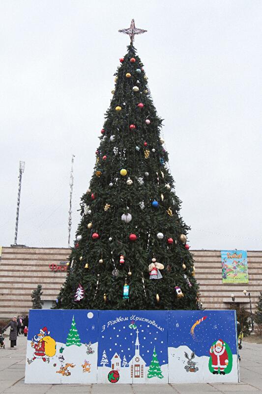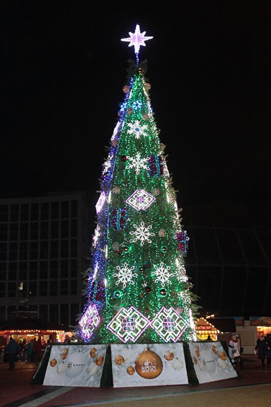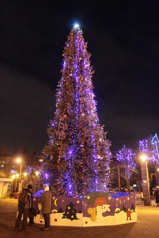 Главная елка установлена возле универмага "Детский мир", на ул. Малышко, 1. Высота ее — 10 метров. Игрушки для украшения елки использовали как новые, так и старые (например, можно на ней увидеть и шарики с символом уходящего года, конем). А вот иллюминацию на елочке в этом году обновили: стробоскопы не просто мигают, но еще и вращаются. Вокруг елки установили огромные поздравительные открытки.