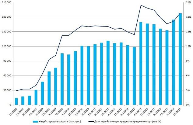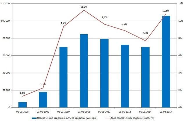 Согласно данным НБУ, за 7 месяцев 2014 года доля просроченной задолженности в общем кредитном портфеле выросла с 7,7 до 10,8%.