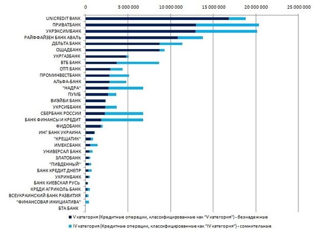 В первую пятерку банков по проблемности кредитного портфеля вошли UniCredit Bank, Дельта Банк, Укрэксимбанк, Райффайзен банк Аваль и Укргазбанк . Лидеры рейтинга имеют высокие объемы и долю недействующих и безнадежных кредитов, быстрые темпы роста проблемных активов или низкое покрытие безнадежных займов резервами под кредитные риски.