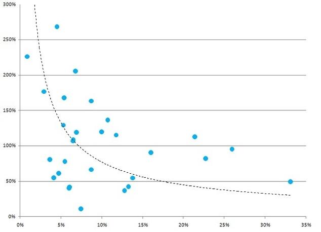 * Обратная зависимость свидетельствует о том, насколько велик для банков соблазн демонстрировать регуляторам низкую долю проблемной задолженности, чтобы достичь лучшего уровня покрытия кредитов резервами при более низких затратах на их формирование. Зато высокий уровень проблемной задолженности не позволяет банкам создать достаточно резервов.