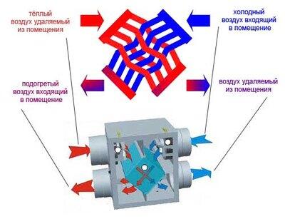 Приточно вытяжная установка с пластинчатым (перекрестноточным) рекуператором представляет собой кассету, состоящую из набора металлических, полимерных или мембранных пластин, в которой приточный и вытяжной потоки воздуха проходят по каналам, разделенным пластинами, потоки воздуха при этом не смешиваются. Вытяжной поток воздуха подогревает пластины и выходит наружу здания, а приточный воздух забирает тепло из пластин, подогревается и доставляется непосредственно в само помещение.