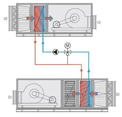 Рекуператоры с промежуточным теплоносителем чаще всего используются в больших производственных помещениях. Теплоносителем тут выступает водно-гликолиевый раствор или просто вода. Вытяжной воздух нагревает теплоноситель, который отдает тепло приточному.