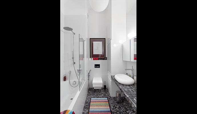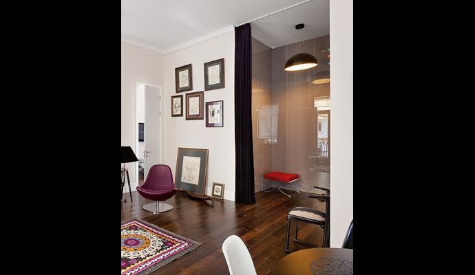 Напольный ковер-сюзане, диван с кожаной обивкой цвета коралла и коллекция графики на стенах — чувственные акценты, придающие интерьеру теплое, непринужденно артистичное звучание. Любопытно решена прихожая. Именно здесь в полной мере проявляется прелесть разумной планировки: за глянцевыми, будто монолитными, стенами небольшого «тамбура» спрятана гардеробная комната! Как и спальня, зона прихожей может быть отделена от living space при помощи раздвижной шторы — прием настолько же простой, насколько и эффектный. Как и вся квартира в целом.