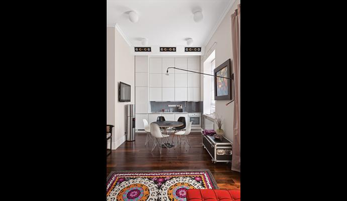 Все остальное — единая территория living space, куда включена даже спальня. Чтобы создать атмосферу защищенности, зона спальни поднята на подиум и при необходимости может быть скрыта подвижной шторой-занавесом. Кстати, сам подиум — чуть ли не главная деталь пространства. Остроумно соединяя несколько функций, он также является системой хранения, а кроме того, визуально разнообразит ландшафт студио. Визави спальни — кухня: мебельный блок встроен в торец кухонного пространства и является неотъемлемой частью архитектуры. Тотальный белый глянец лаконичного фасада и графичные структуры обеденного стола и стульев Vitra создают слегка футуристическое настроение — свежо, технологично, стерильно. Более того, вся кухонная зона легко превращается в домашний кинотеатр - просто опускается скрытый экран.