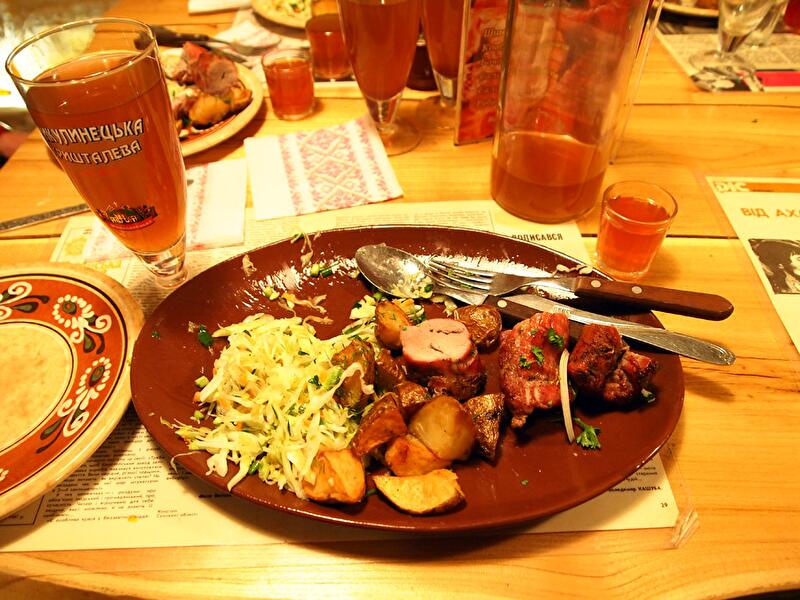 В теплый период можно прекрасно здесь провести время на просторной открытой террасе, где вкус копченой колбасы, мясной запеканки, ароматного украинского борща или же перемолотого сала со специями, которое здесь называют «украинским наркотиком», кажется еще изысканнее.