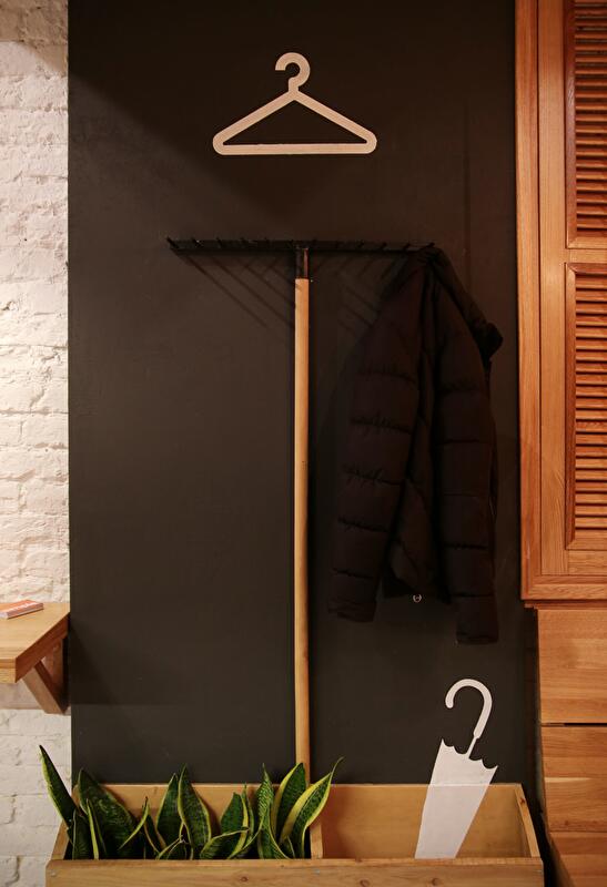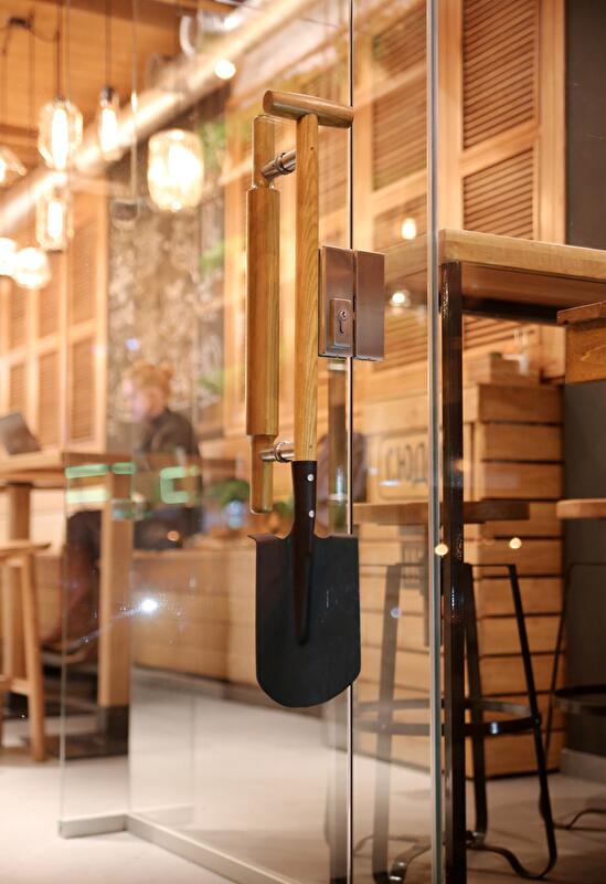 Также дизайнеры решили разбавить пространство интерьера авторским декором. Переосмыслив некоторые детали и посмотрев на привычные незатейливые предметы под другим углом, они придумали дверную ручку из лопаты, крючки для верхней одежды из грабель, меню для напитков из скалок, бетонные светильники из старых пластиковых бутылок.