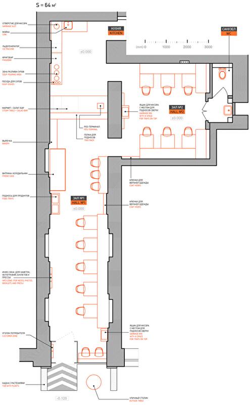 «В связи с тем, что в ресторане частичное самообслуживание, потенциальный клиент должен пройти определенные небольшие «этапы» перед тем, как сможет поесть. Мы сделали ставку на сочетании вытянутой формы первого зала с простой и понятной навигацией в виде пиктограмм-подсказок», – рассказывают они.