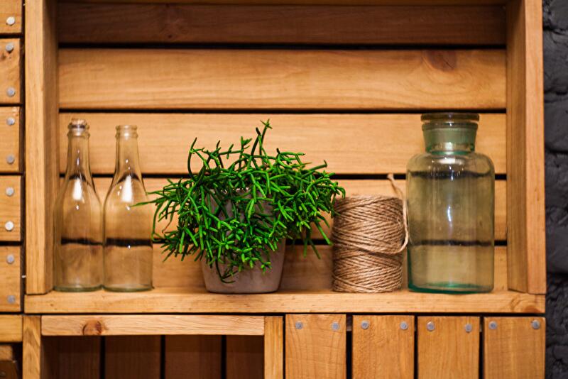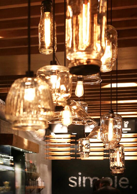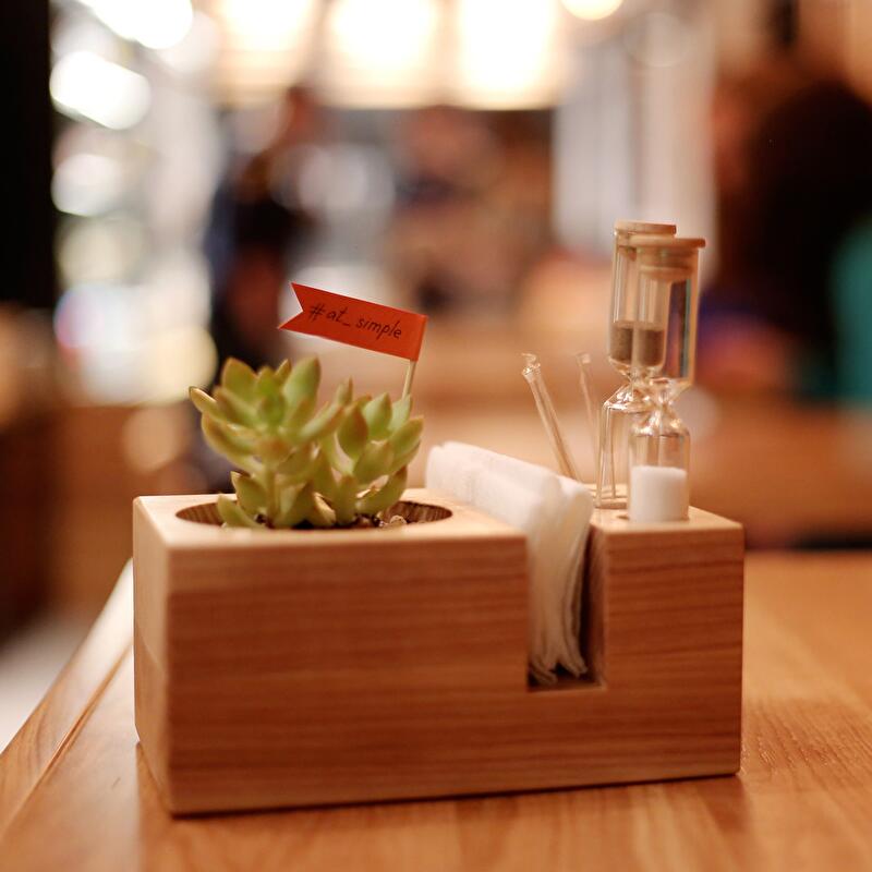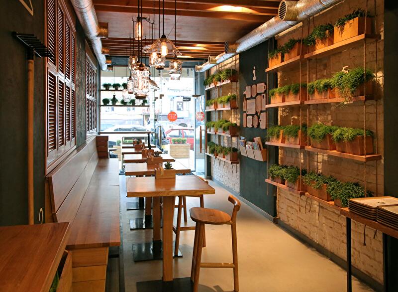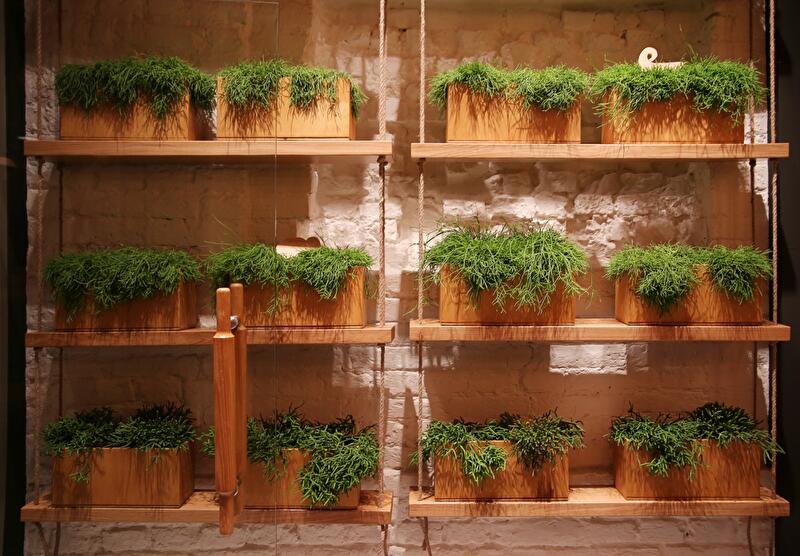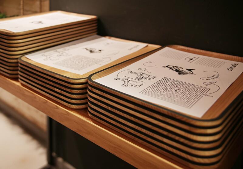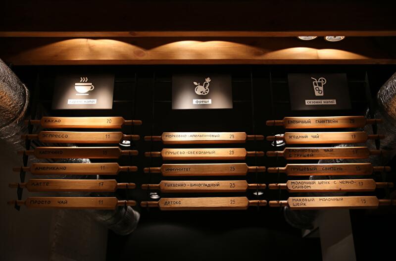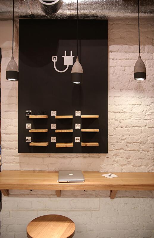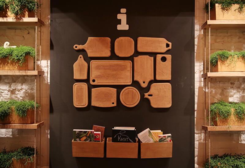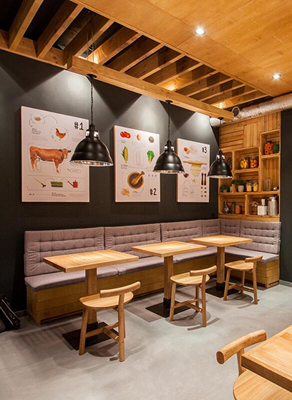 Главный девиз ресторана «Будь проще – ешь проще» предполагал использование таких же простых натуральных цветов и материалов в интерьере: дерева, фанеры, крафт-бумаги (конечно же, при условии сохранения их естественных фактур).