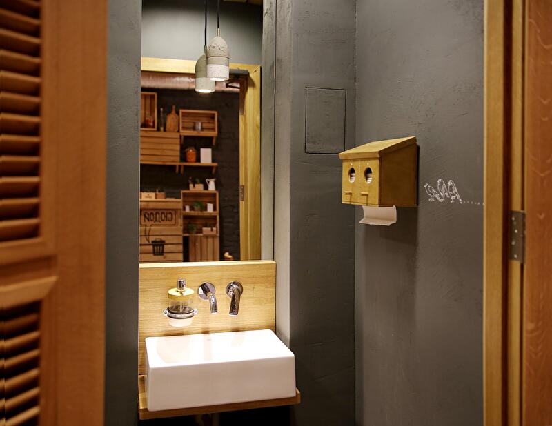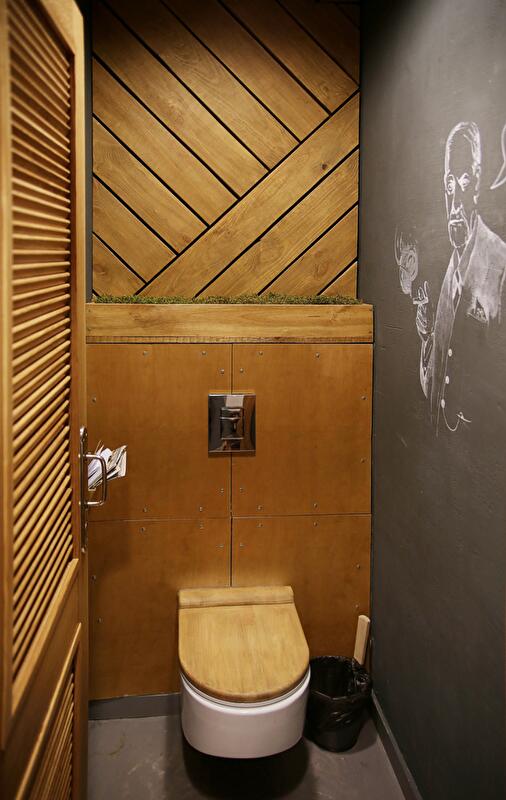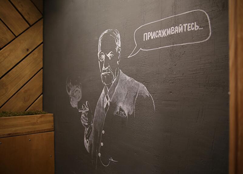 Из общей концепции «простого» ресторана немного выбивается разве что санузел. В отличие от других помещений заведения, где все просто, тут… не все так просто. Здесь посетителя внезапно встречает сам Зигмунд Фрейд, предлагая «присесть»: уединиться, расслабиться и дать волю бессознательному.