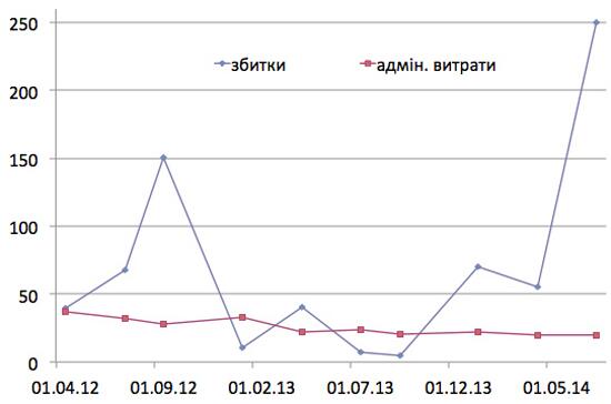 На графике есть еще одна любопытная кривая - убытки "Родовода". Сначала они убывали и вдруг, как по мановению волшебной палочки, полетели вверх и составили 250 млн грн в 2014 году. Куда стали исчезать деньги? Снова вопрос к Генпрокуратуре.