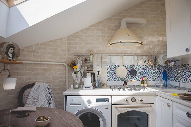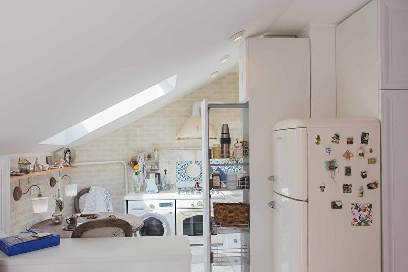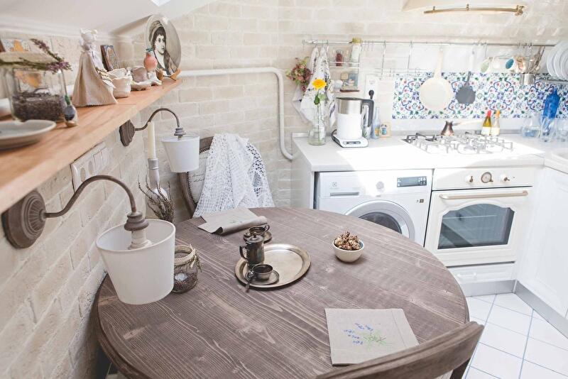 Маленькая квартира под крышей девятиэтажного дома в Киеве стала площадкой для масштабной переделки. Однушку нужно было поделить на спальню и гостиную, встроить в маленькую кухню большую постирочную и поставить обеденный стол. А еще украсить получившуюся квартиру в духе прованса.