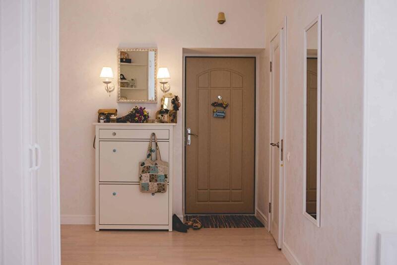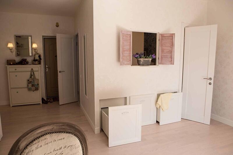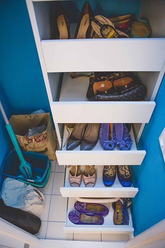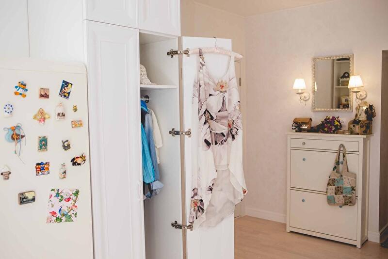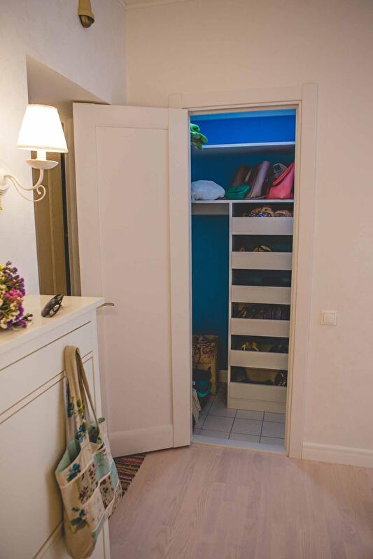 В зоне спальни предусмотрен «гардеробный угол» с отдельным комодом для белья и украшений, полками для одежды. Со временем хозяйка добавила еще крючки для поясов на стене возле комода. В квартире имеется отдельная кладовая размером всего один квадратный метр. Особая гордость – размещенный там огромный комод для обуви и мелких аксессуаров. Этот пример в очередной раз доказывает – чем меньше зона хранения, тем проще ее использовать максимально.