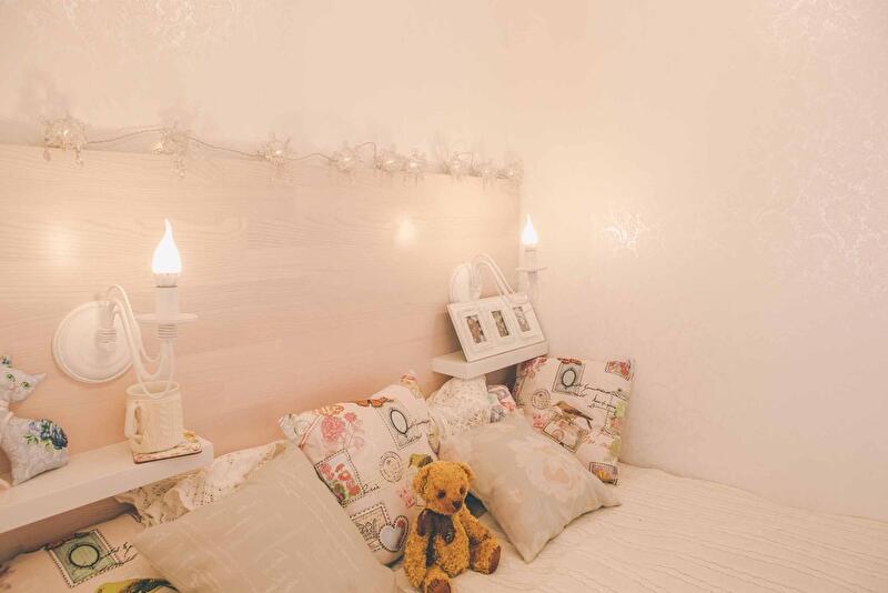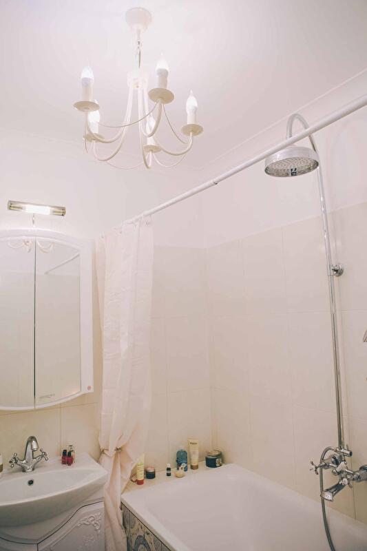 Для того чтобы добавить простора помещению, светильниками выделена каждая зона. На кухне точечные потолочные споты обрамлены гипсовыми розетками, столовую зону подсвечивают бра с белыми абажурами. Похожими бра мы оформили и прихожую. В гостиной висит изящная люстра возле балконной двери, такие же светильники с лампами-свечами – в спальне, ванной и санузле. Использование полноценного освещения в ванной (люстра и бра) визуально приближает ее к комнате – соответственно, добавляет простора.