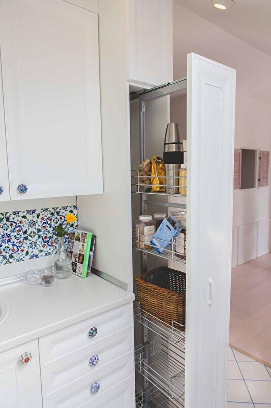 В прихожей есть большой шкаф для верхней одежды, в нем же открытые полочки для украшений и книжек; дополнительная галошница ИКЕА – чтобы скрыть ее происхождение, ручки заменили на керамические Butlers. В ванной хранение предусмотрено под умывальником и в зеркальном шкафчике, также оставлен зазор для баночек на бордюре ванны (личное пожелание хозяйки). Возможна организация кладовки на балконе, так как половина балкона находится под низкой частью крыши.