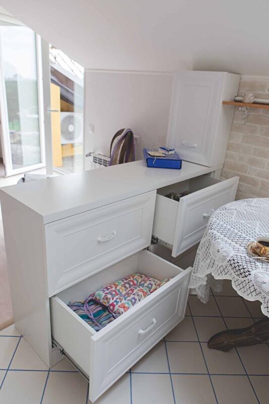 Поскольку пространство явно меньше, чем ожидания от него, пришлось бороться за каждый угол. В кухне спасает двухметровое карго, которое вмещает в себя все продукты и мелкие кухонные штучки, а также комод-разделитель. Его глубина всего 40 сантиметров, но при ширине 1,5 метра в него помещается кухонная утварь и счетчик. Посуда, приборы и мелочи на виду – кроме вышеперечисленного, систем хранения в кухне (вроде обычного гарнитура) нет.
