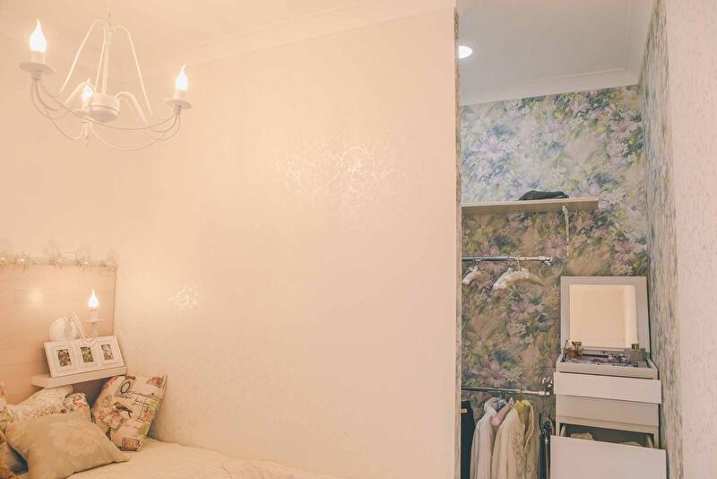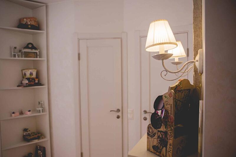 Светлая, почти белая палитра – требование заказчицы. Но чтобы не делать интерьер стерильным и холодным, мы внесли в него сложные оттенки, разные фактуры, мелкий рисунок – и поиграли с выбеленными пастельными тонами. Цветные капли оттеняют белый, не давая резкого контраста – дверные ручки, обои с патиной, люстры со стеклярусом лишь слегка добавляют красок.