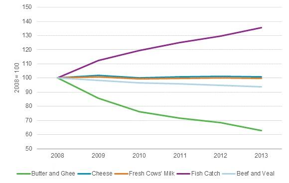 Производство отдельных продуктов питания в РФ за 2008-2013 гг.