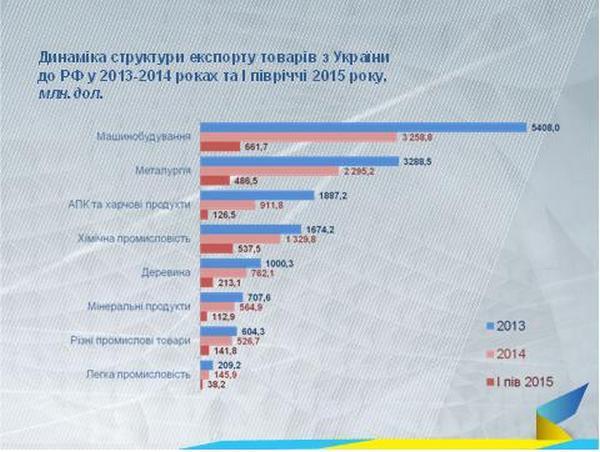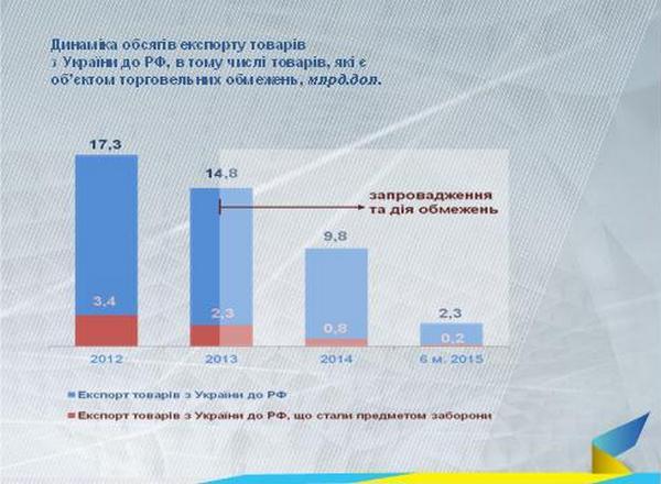 За последние несколько лет позиция РФ как торгового партнера Украины постоянно ослабляется. Начиная с 2012 года доля РФ во внешнеторговом обороте Украины сократилась вдвое - с 29,6 до 14,5%. По приведенным выше причинам сокращение доли экспорта происходит более высокими темпами, чем импорта. Для справки: все аналогичные показатели Украины во внешней торговле товарами РФ варьируются в пределах от 3 до 6%.