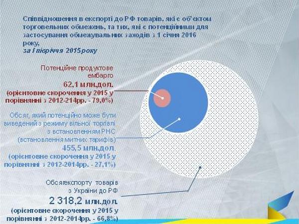 Но, как уже было отмечено, действия РФ в течение последних лет существенно ограничили торговлю товарами между странами. Если опираться на данные первого полугодия 2015 года, повышение пошлин может быть применено к экспорту общей стоимостью $455,5 млн, или всего 2,5% от общего украинского экспорта, а эмбарго - на товары ценой $62 млн.