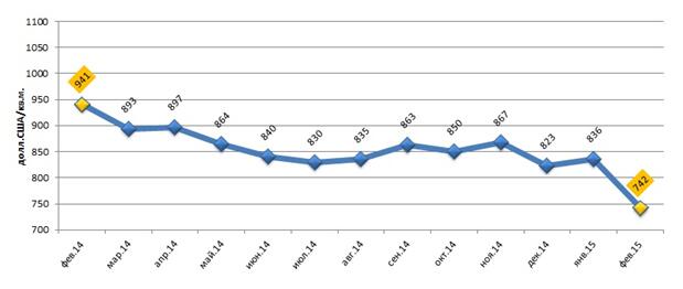 Рис. 1. Средневзвешенная цена предложения продажи в долл.США за 1 кв.м офисной недвижимости города Харькова февраль 2014 – февраль 2015 года