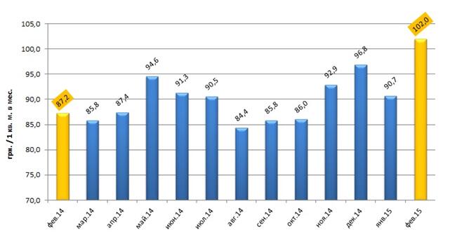 Средневзвешенный ценовой показатель рынка офисной недвижимости в сегменте аренды в феврале 2015 года зафиксированы на значении – 102 грн./кв.м., это на 17 % больше, нежели в феврале 2014 года – 87,2 грн./кв.м (рис. 2). Незначительное повышение арендной ставки обусловлено не столько с желанием собственников увеличить уровень дохода, сколько с объективными изменениями эксплуатационных и коммунальных затрат: повышение стоимости электроэнергии, отопления, и ряда других факторов. Позитивных изменений и роста рынка аренды офисной недвижимости в 2015 году ожидать не следует.