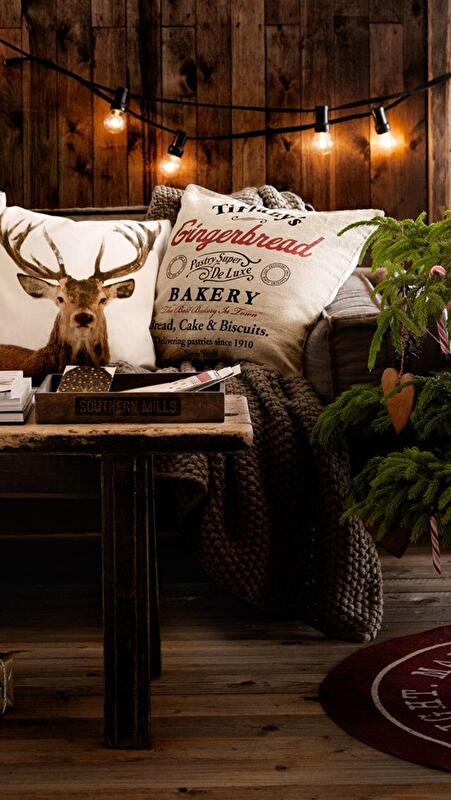 Если внутренняя отделка коттеджа выполнена из дерева натурального цвета, то будет уместно дополнить интерьер текстилем из небеленной шерсти, льна, вязаными покрывалами. Оленьи рога на стене и меховая шкура на полу — классика стиля шале, которая будет очень кстати в рождественском интерьере коттеджа.