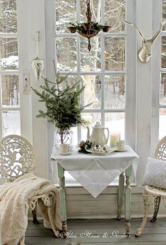 Если же интерьер коттеджа выполнен в стиле английского кантри, в светлых тонах с крашенными в белый цвет рамами и полом, то зимний декор в белых тонах будет как раз кстати: белый текстиль и натуральные еловые ветки даже не требуют дополнительных украшений.