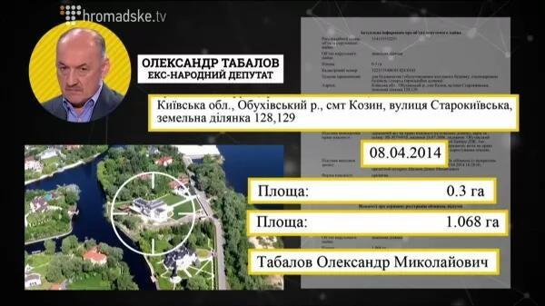 Поруч з подарунком Шуфрича розташувався дім, який, імовірно, належить Олександру Табалову – екс-нардепу «Блоку Юлії Тимошенко», який свого часу «прославився» своєю відмовою входити до фракції «Батьківщина», за що і отримав від колег ганебне звання «тушки». У квітні 2014-го Табалов оформив на себе дві ділянки на Старокиївській, 128 і 129. До речі, нині за «сотку» землі тут просять 7-9 тисяч доларів. Відтак, табаловські півтора гектари елітної землі «тягнуть» на дуже солідну суму. На оформленій землі вже можна побачити будинок, який більше нагадує невеличкий палац.