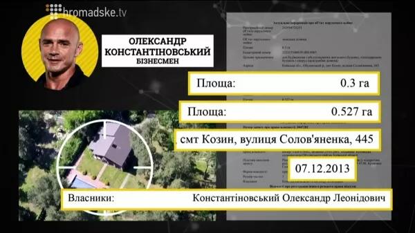 Обидва теж мають в елітному селищі землю. Причому Олександр Константіновський, за даними Реєстру, оформив 0,3 і 0,5 гектарів на Солов’яненка, 445 на початку грудня 2013 року, тобто – в розпал ЄвроМайдану.