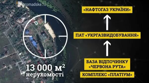 Посеред моря приватної власності нам вдалося знайти й державний острівець. Це база відпочинку «Червона Рута» і комплекс «Платіум». Загалом майже 13 000 квадратних метрів нерухомості перебувають у власності ПАТ «Укргазвидобування», акціями якого володіє державний «Нафтогаз України».