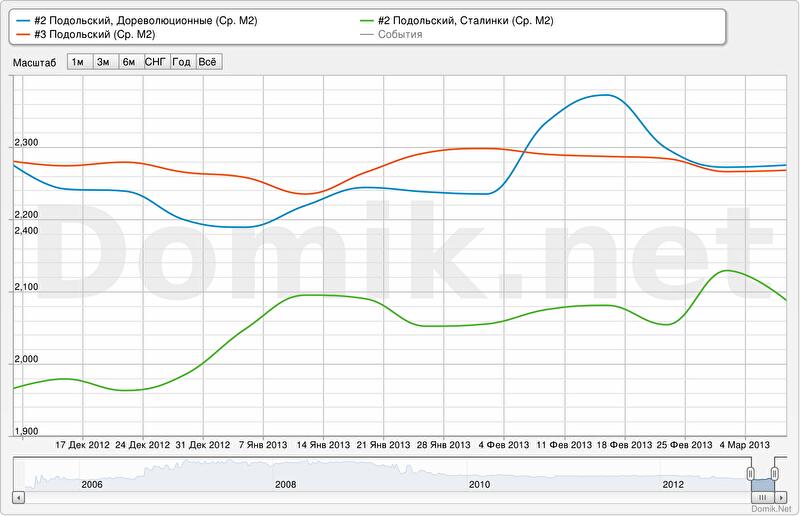 График №2. Изменение статистики цен предложений в долларах за квадратный метр в сегментах «дореволюционные дома», «сталинки», а также возле метро в Подольском районе;