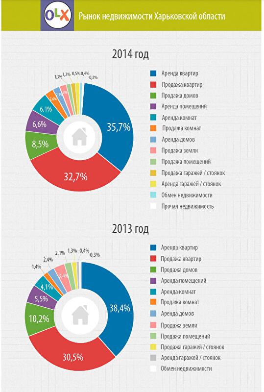 В целом количество новых предложений об аренде и продаже объектов недвижимости в Харьковской области выросло на 5,8% по сравнению с 2013 годом. На продажу было выставлено на 13% больше квартир. Рост также наблюдался в направлениях аренды помещений, продажи и аренды комнат, обмена недвижимости. В то же время, меньше предложений касалось аренды квартир, продажи и аренды домов, продажи помещений, гаражей и стоянок. Наибольшее падение новых предложений зафиксировано в рубрике «Продажа земли»: в 2014 году на продажу было выставлено на 62% меньше земельных участков, чем в 2013 году.