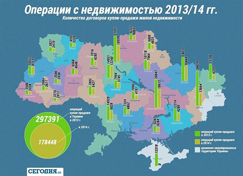 Так, согласно имеющейся информации, в 2013 году в пятерке областей-лидеров по количеству договоров купли-продажи жилой недвижимости в Украине были Киевская (учитывая продажи в столице), Днепропетровская, Харьковская и Луганская. В 2014 ситуация поменялась с учетом начала боевых действий на Донбассе. Лидерами по продажам стали Киевская, Днепропетровская, Харьковская, Донецкая и Одесская области. В целом, объемы продажи жилой недвижимости в 2014 уменьшились во всех регионах Украины.