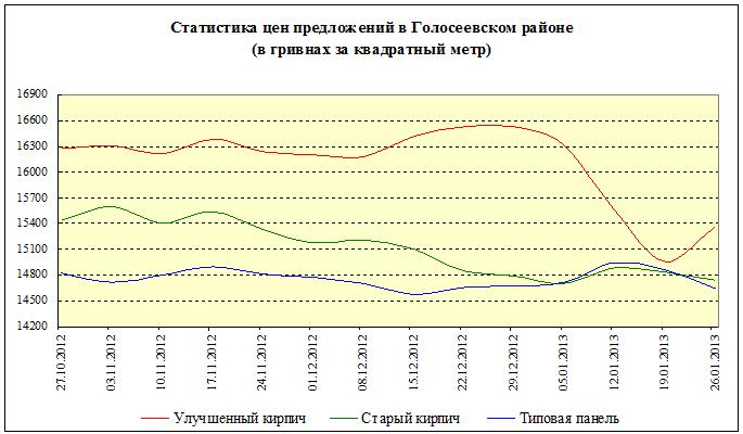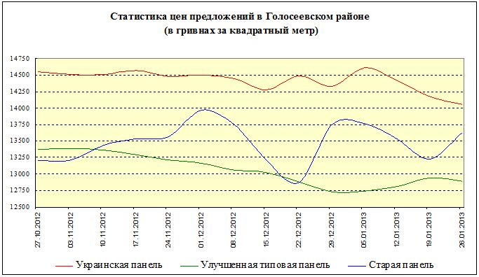 Статистика цен предложений (в гривнах за квадратный метр) в сегменте «типовая панель» в Голосеевском районе за последние три месяца снизилась на 1,3%; за последнюю неделю снизилась на 1,5%
