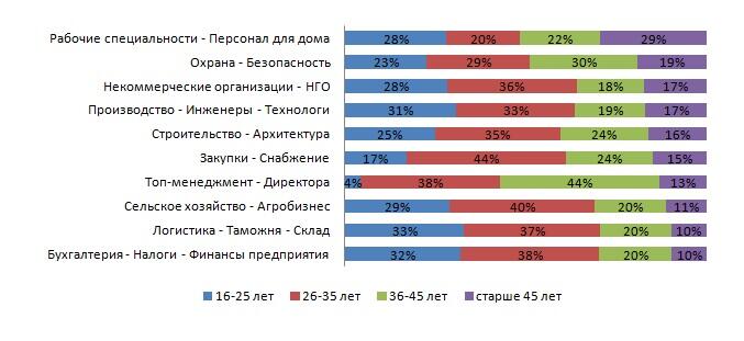 10 профессиональных сфер, где больше всего соискателей в возрасте более 45 лет, согласно резюме, размещенных на портале rabota.ua