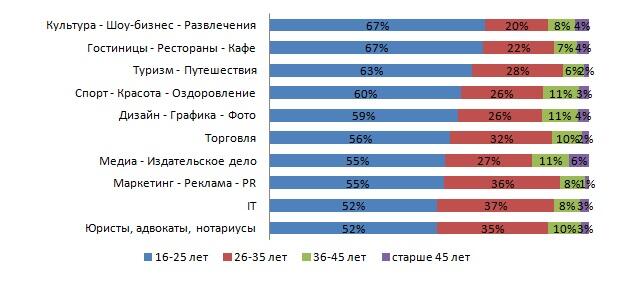 Молодежь наиболее активна совершенно в других сегментах: лидером по резюме молодых специалистов являются сферы шоу-бизнеса и гостеприимства (отели, рестораны кафе). Далее молодежь выбирает сферы туризма, спорта-оздоровления и дизайна. Популярен старт карьеры в сфере торговли, медиа, рекламы и ИТ. Удивительно, но молодежь активно стремится в юридическую сферу. Хотя, учитывая количество вузов, добросовестно выпускающих юристов, удивляться, в общем, нечему.