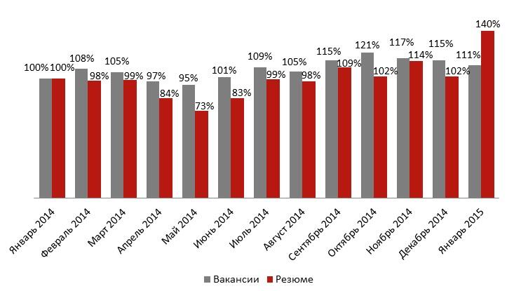 Тем не менее, ситуация по вакансиям в январе этого года лучше, чем в январе прошлого, невзирая на то, что года 2014 был гораздо сложнее экономически, чем год 2013.