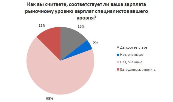 Ввиду кризисного состояния экономики украинцы остаются недовольны своими доходами. По данным опроса кадрового портала rabota.ua, подавляющее число украинцев (68%) находят свою заработную плату на порядок ниже той, которой достоин специалист их уровня. При этом 15% респондентов считают свой доход абсолютно адекватным уровню специализации, а еще 5% опрошенных заявили, что получают более того, чего на самом деле заслуживают. 13% участников опроса затруднились с ответом на данный вопрос.