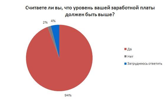 При этом нашлось лишь 2% опрошенных, которые не хотели бы повышения своего дохода, еще 4% из числа опрошенных затруднились с ответом на вопрос о том, должен ли их оклад возрасти. 94% респондентов сообщили, что справедливым бы было увеличение их заработной платы.