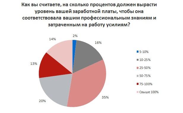 Так, 16% участников опроса остались бы довольны увеличением их оклада на 10-25%, каждый третий из числа опрошенных считает справедливым увеличение своего дохода на 25-50%. До 75% прибавки к зарплате считает обоснованным каждый пятый участник опроса, а 13% респондентов находят свои знания и умения достойными вдвое большей зарплаты. Свыше 100% надбавки хотели бы получить 14% украинцев.