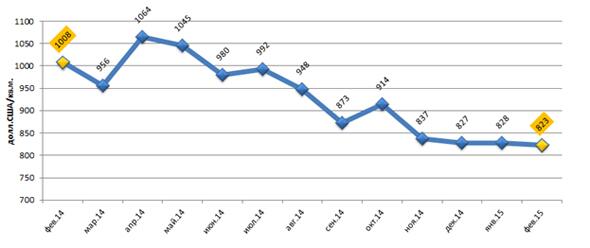 Рис. 1. Средневзвешенная цена предложения 1 кв.м. жилья на вторичном рынке г. Харькова февраль 2014 – февраль 2015 г.