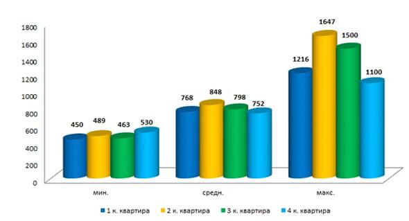 Минимальная цена квадратного метра зафиксирована на уровне – 450 долл.США/кв.м. в однокомнатной квартире выставленной на продажу в новострое со строительным состоянием в удаленном районе. Собственник, купивший недавно данную квартиру у застройщика, предложил ее к продаже на вторичном рынке по рыночной цене в долларовом эквиваленте (рис. 4). Максимальная цена предложения в феврале 2015 года зафиксирована на двухкомнатную квартиру в центральной части города с евро ремонтом – 1647 долл.США/кв.м.