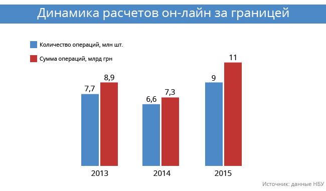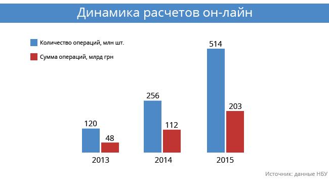 По данным Национального банка Украины в 2015 году в Украине совершено 514 млн операций в интернете с помощью банковских карточек на сумму 202 млн грн. В 2014 объем онлайн операций с помощью карт составил 112 млрд грн, а в 2013-ом - всего 48 млрд грн. Общий объем операций через интернет превысил 50% от общей суммы безналичных операций с использованием платежных карт.