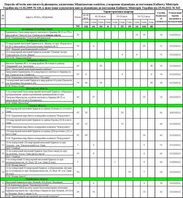 На утверждение объектов для первого этапа госпрограммы Министерство регионального развития, строительства и ЖКХ потратило меньше месяца. На сегодняшний день отобрано 542 квартиры в 16 жилых домах, которые расположены в Крыму, Волынской, Сумской, Запорожской, Полтавской и Черновицкой областях. По словам главы Минрегионстроя Анатолия Близнюка, все дома — долгострои. Это объекты, которые были частично профинансированы, но застройщики не смогли их завершить. Так что с помощью льготной ипотеки государство убивает еще одного зайца — помогает строительным фирмам закончить возведение своих домов.