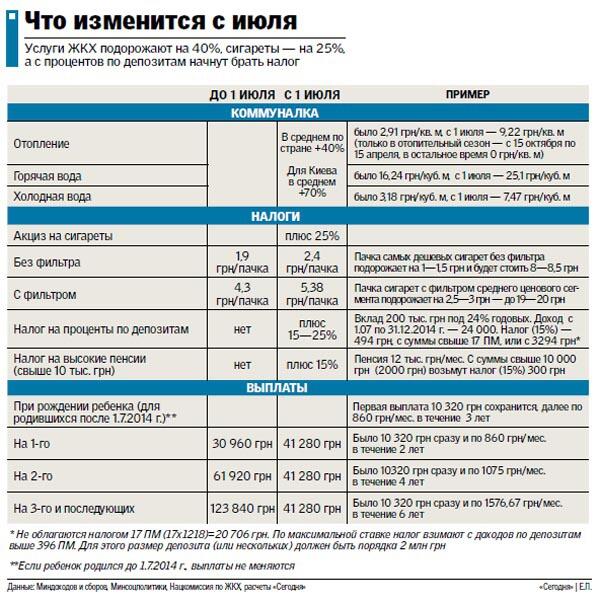 С сегодняшнего дня траты практически всех украинцев вырастут, а доходы некоторых даже уменьшатся: в силу вступили изменения в законодательство (см. инфографику). Так, с 1 июля в Украине дорожает коммуналка и табачные изделия, а люди, которые получают большие пенсии или имеют солидные (от 100 тыс. грн) накопления в банках, станут платить с них налоги.