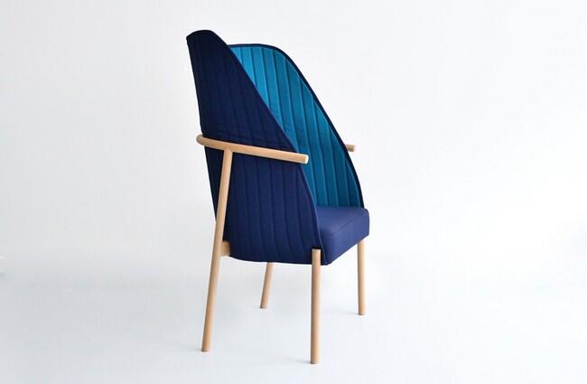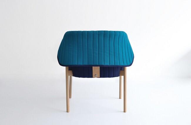 Каркас кресла выполнен из гнутой древесины бука, а «плед» изготовлен из экологичных тканей двух цветов.