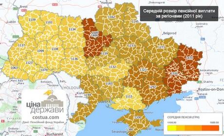 Согласно данным за 2011 год, средний размер пенсионных выплат в Киеве и Киевской области соответственно составил 1689 и 1488 гривен в месяц, в Донецкой области - 1550 гривен, в Луганской области - 1470 гривен.