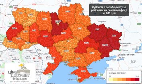 Также в исследовании приводятся данные по регионам по поводу субсидий из госбюджета в Пенсионный фонд. Тоже за 2011 год.
