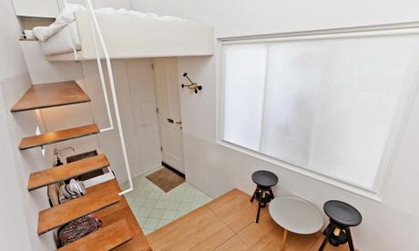 Обеденный стол величиной с чайный поднос, пара стульев и две напольные подушки, раковина и плитка в углу - вот и все убранство этого спартанского жилища. На площади в 17,5 квадратных метров не нашлось места для кровати, поэтому ее сделали в форме навеса (2,29 м x 1,73 м). Одежду и предметы первой необходимости придется хранить во встроенных полках под полом кухни-столовой. В скученной ванной едва разместились душ и туалет.