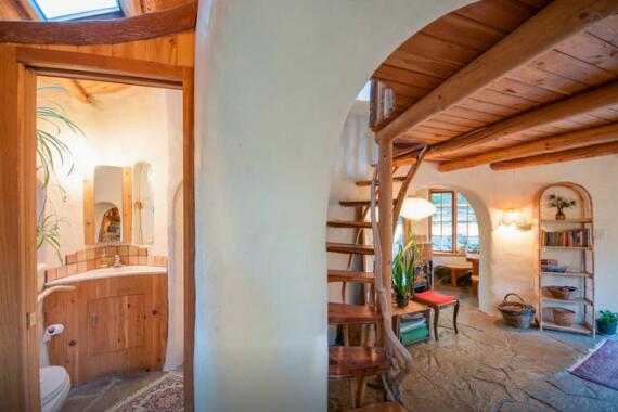 Пара, которая купила этот дом увидела его картинку дома [прежде, чем они знали друг друга], и это заставило их поехать на семинар по строительству домов из соломы", рассказывает Кит Мэлони из Cobworks. «Они встретились у нас в 2004 году, а на следующий год поженились и в настоящее время владеют в этим соломенным домом, который свел их вместе.» ![]()
